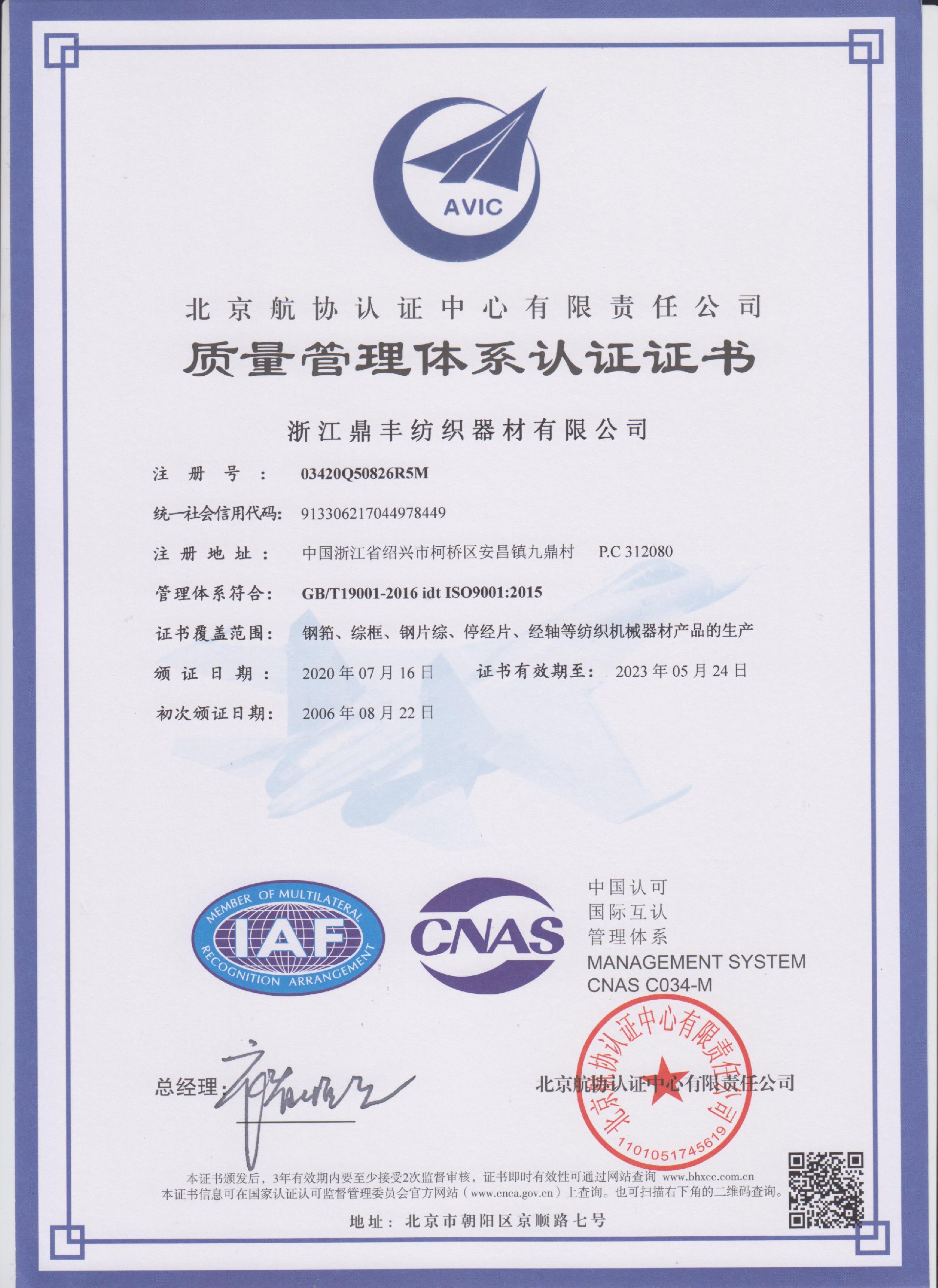 浙江鼎豐紡織器材有限公司始建于1986年,是一家專業(yè)生產(chǎn)各類無(wú)梭織機(jī)用鋼筘:噴氣筘、噴水筘、劍桿筘、其他類型鋼筘;鋁合金綜框、鋼片綜、停經(jīng)片、經(jīng)軸、織軸、卷布輥等產(chǎn)品及配件的民營(yíng)企業(yè)。